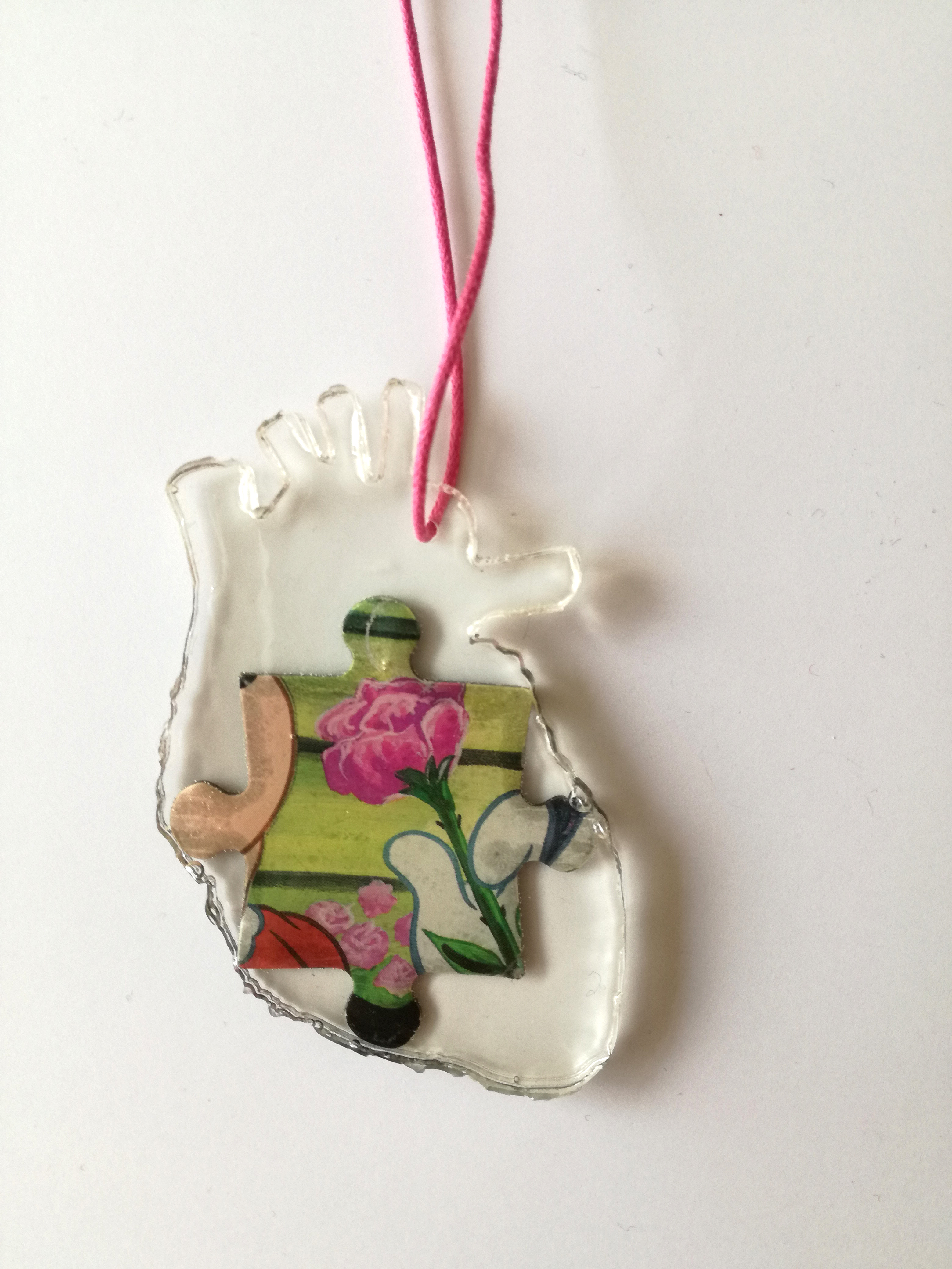 Epoxy hanger in de vorm van het menselijk hart met puzzelstukje. Het koord is verstelbaar in lengte en minimaal 60cm lang. De hanger is ongeveer 8×4,5cm groot. Inclusief vilten zakje tegen het krassen.