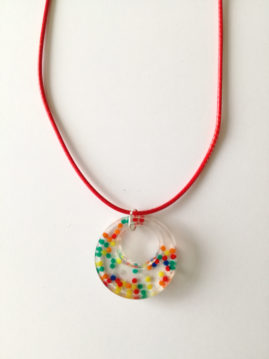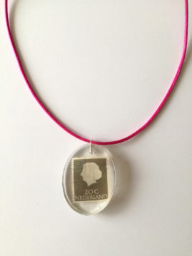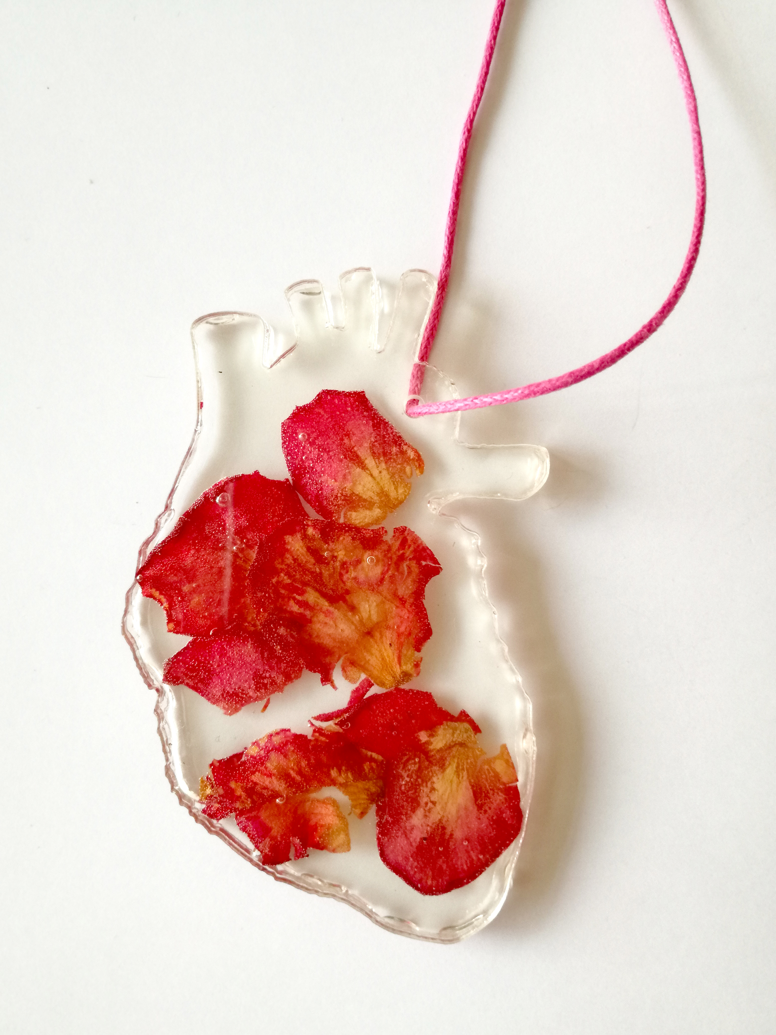 Epoxy hanger in de vorm van het menselijk hart met gedroogde rozenblaadjes. Het koord is verstelbaar in lengte en minimaal 60cm lang. De hanger is ongeveer 8×4,5cm groot. Inclusief vilten zakje tegen het krassen.
