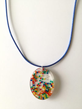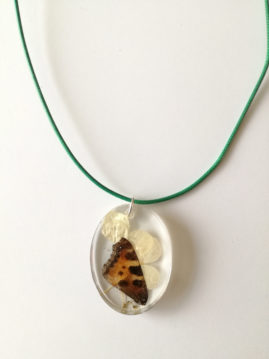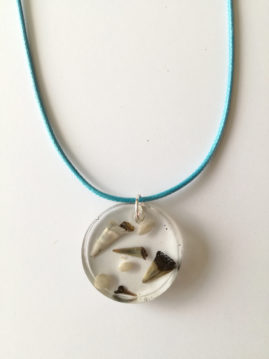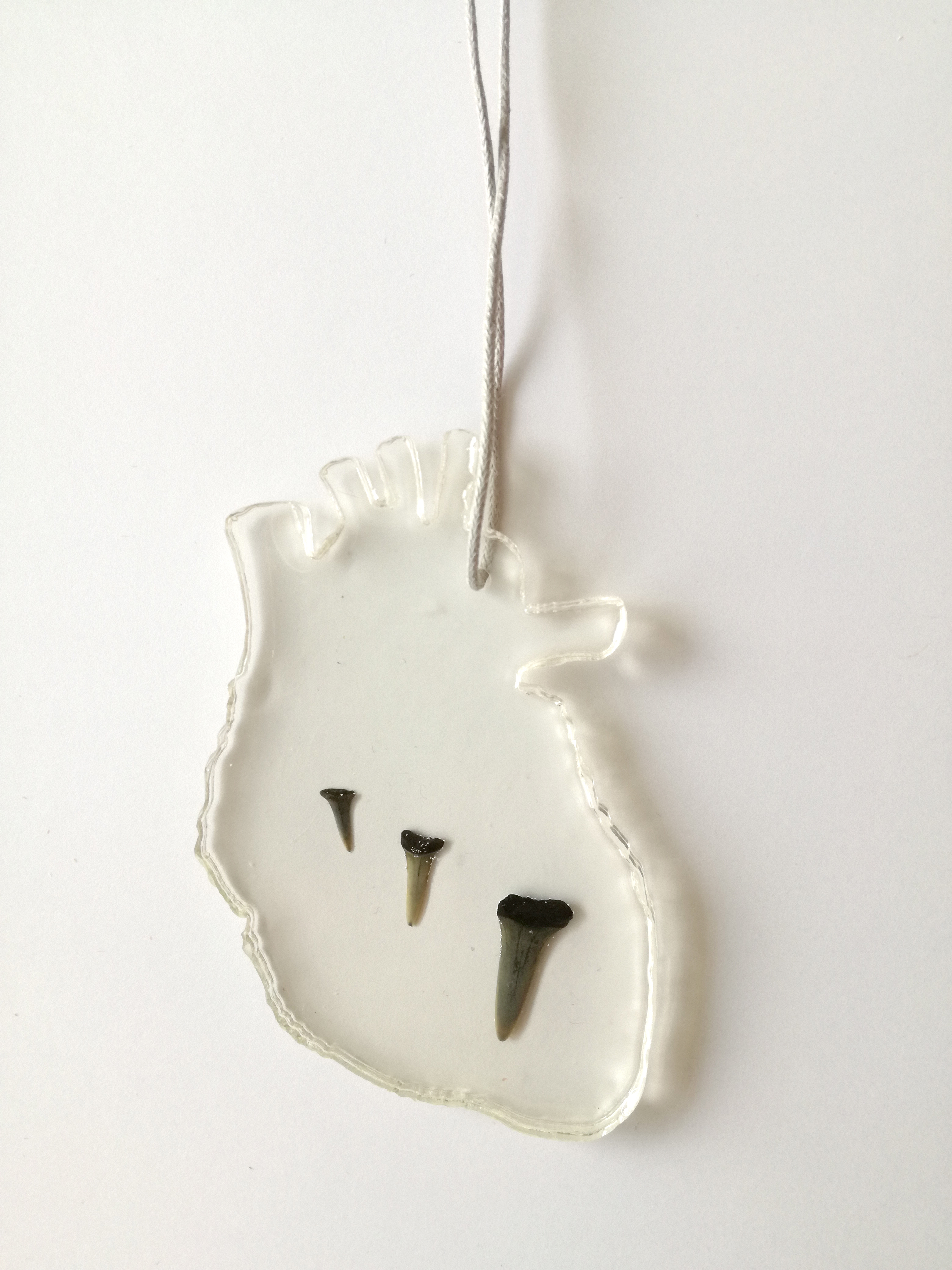 Epoxy hanger in de vorm van het menselijk hart met haaientanden. Het koord is verstelbaar in lengte en minimaal 60cm lang. De hanger is ongeveer 8×4,5cm groot. Inclusief vilten zakje tegen het krassen.
